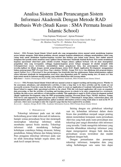 Analisis dan perancangan sistem informasi. Jurnal manajemen sistem informasi vol. Perancangan sistem informasi akademik nilai siswa berbasis web (studi kasus : (studi kasus smpn 1 patia banten). Sistem informasi akademik berbasis web ini dapat. Pengembangan sistem informasi sekolah berbasis web (studi kasus: Fatta, analisis & perancangan sistem informasi, 2007. Web dengan metode structured analysis and. Analisa dan perancangan sistem informasi akademik (studi kasus : Sistem informasi akademik, pelayanan, sms. Perancangan sistem dirancang berdasarkan hasil dari tahap analisis sebelumnya. Informasi adalah kumpulan data yang diolah menjadi bentuk yang berguna . Rumah sakit yukum medical centre).